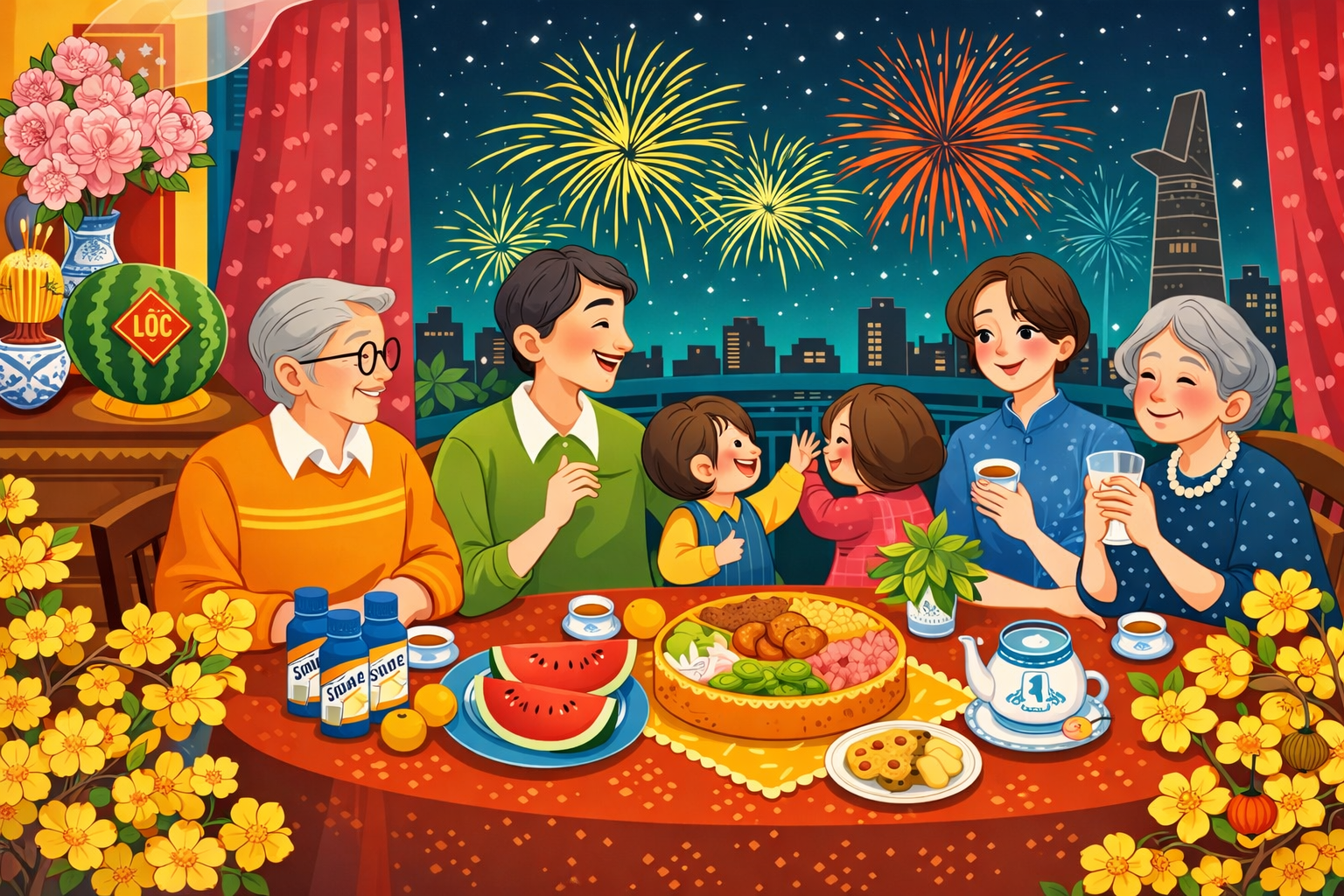 Đúng 12 giờ đêm, nhiều nơi có pháo hoa (fireworks). Người dân có thể xem pháo hoa ở trung tâm thành phố hoặc trên tivi. Sau đó, mọi người chúc nhau lời chúc (good wishes) tốt đẹp như “Chúc mừng năm mới” hay “An khang thịnh vượng” (prosperity and well-being).